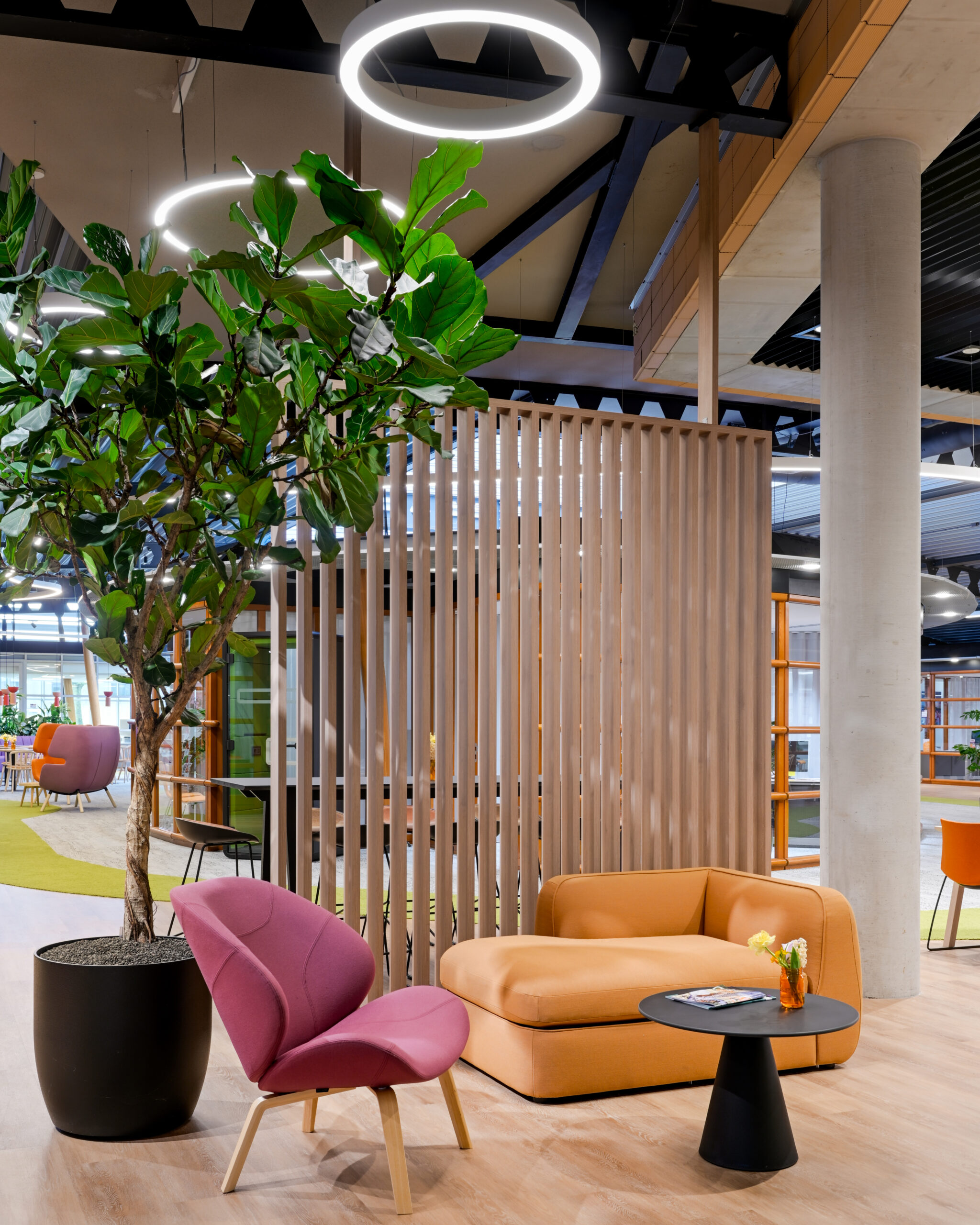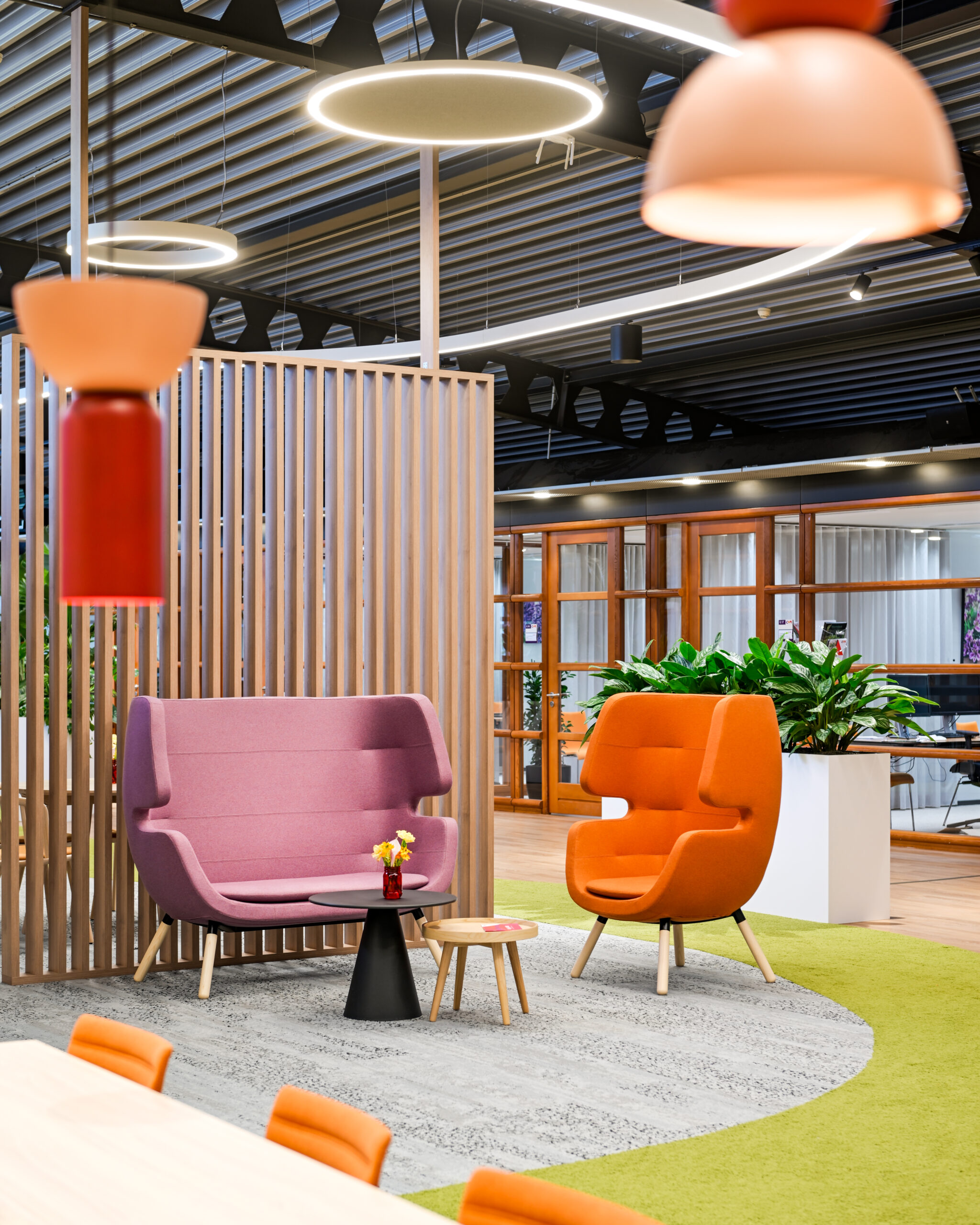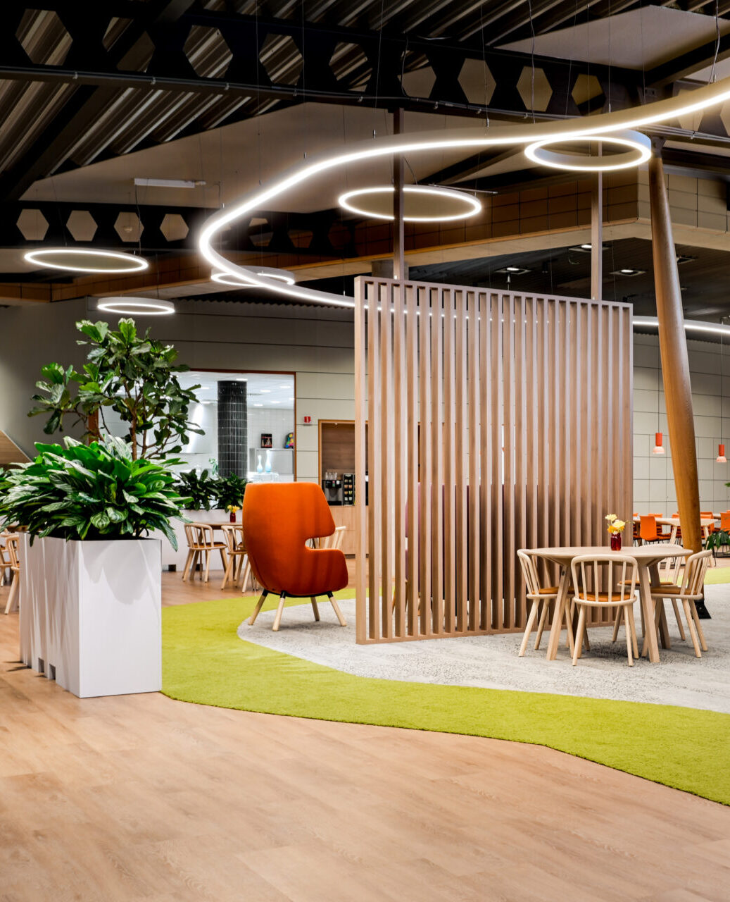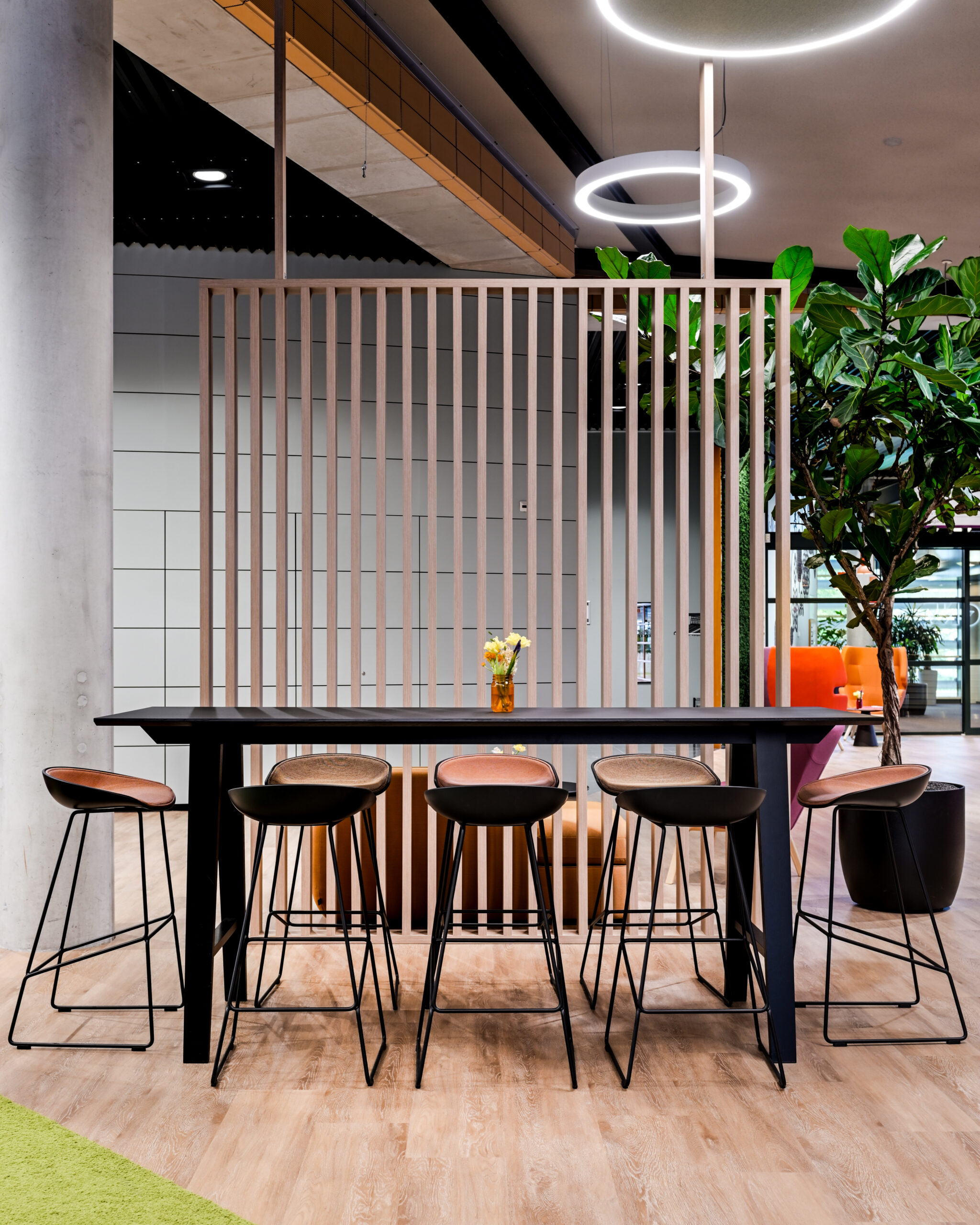 In de ruimte zijn grote roomdividers geplaatst, opgebouwd uit houten latten. Deze verdelen de werkvloer op een open manier en zorgen voor privacy, zonder het ruimtelijke gevoel te verliezen.