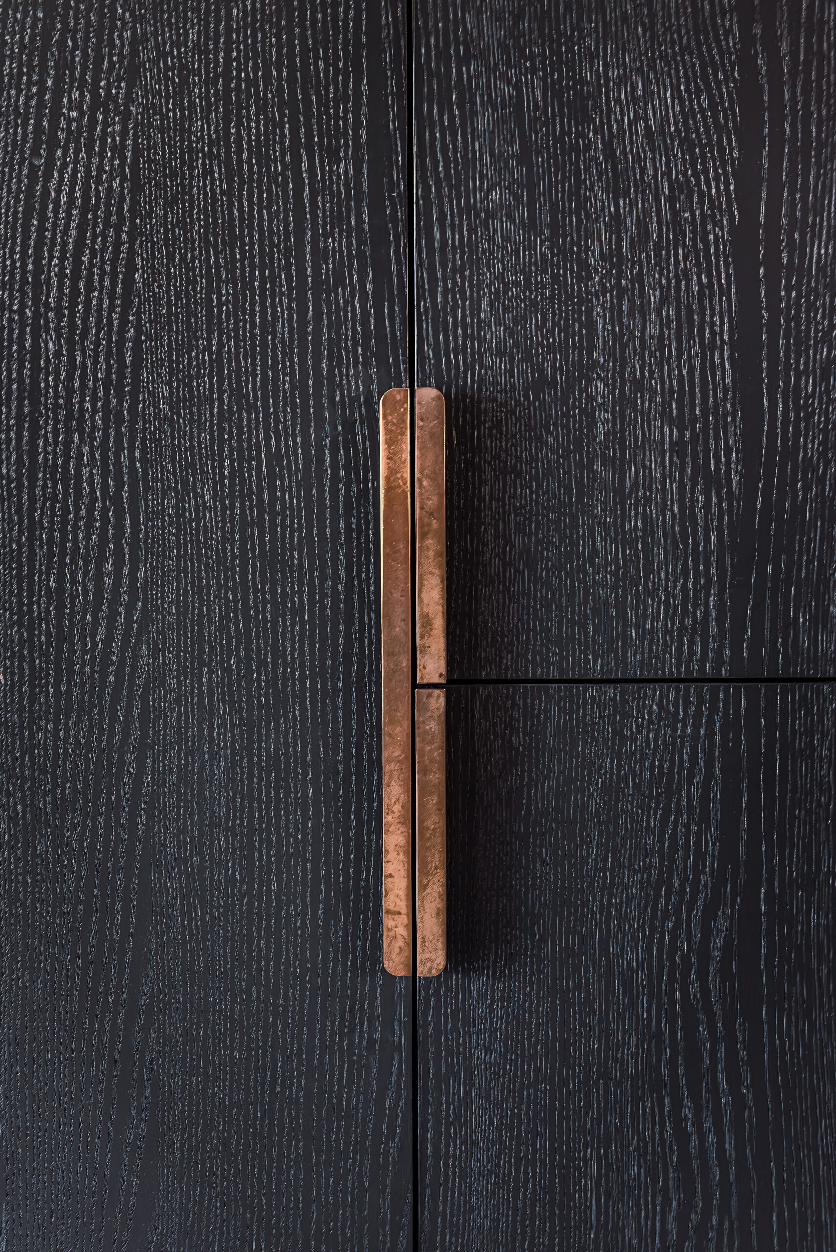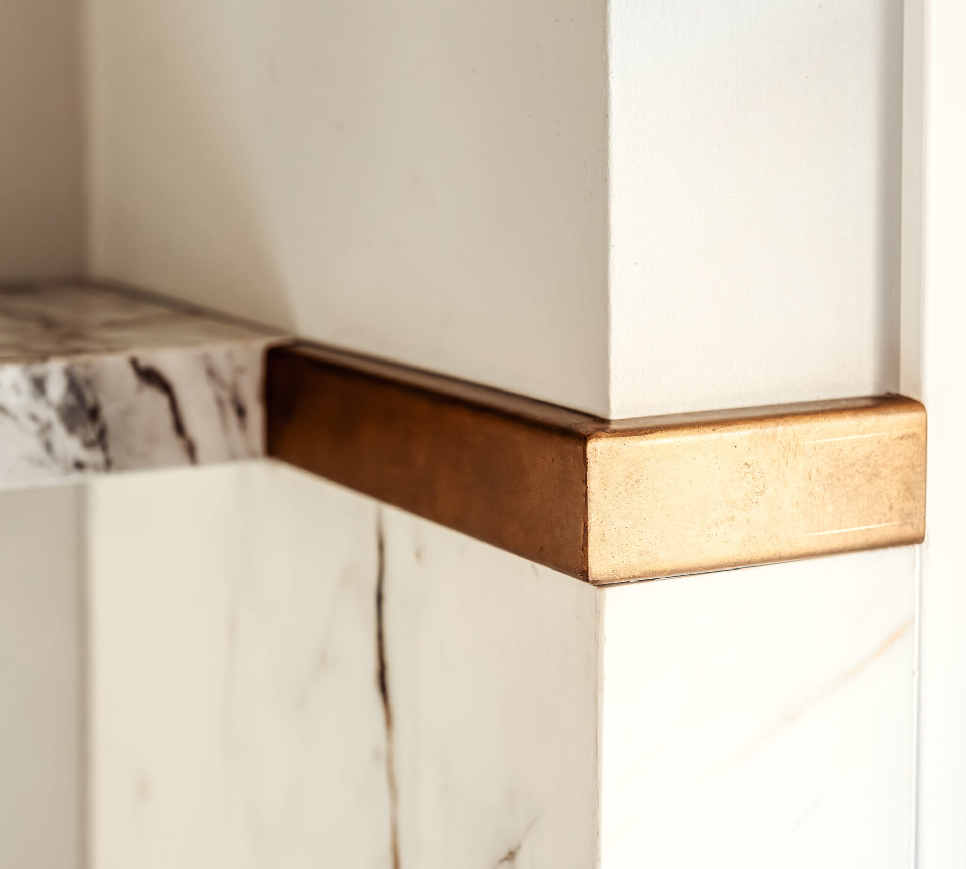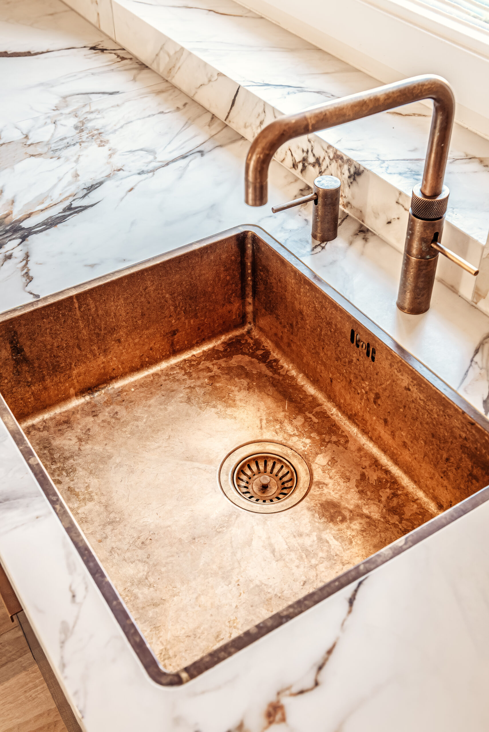 In de details komt het maatwerk duidelijk naar voren. De messing greepjes geven de keuken een warme uitstraling en sluiten aan op de gepatineerd messing spoelbak en kraan. Boven de achterwand loopt een messing strip, die vanuit de wandplanken naadloos doorloopt tot bij het raam en zo zorgt voor een verfijnde verbinding tussen de elementen.