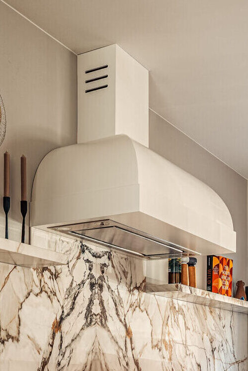 Een bijzonder onderdeel van deze keuken is de afzuigkap, die volledig op maat is gemaakt en rond is gebogen. Deze vormt een zacht en elegant contrast met de strakke lijnen van het maatwerk en het keramiek.